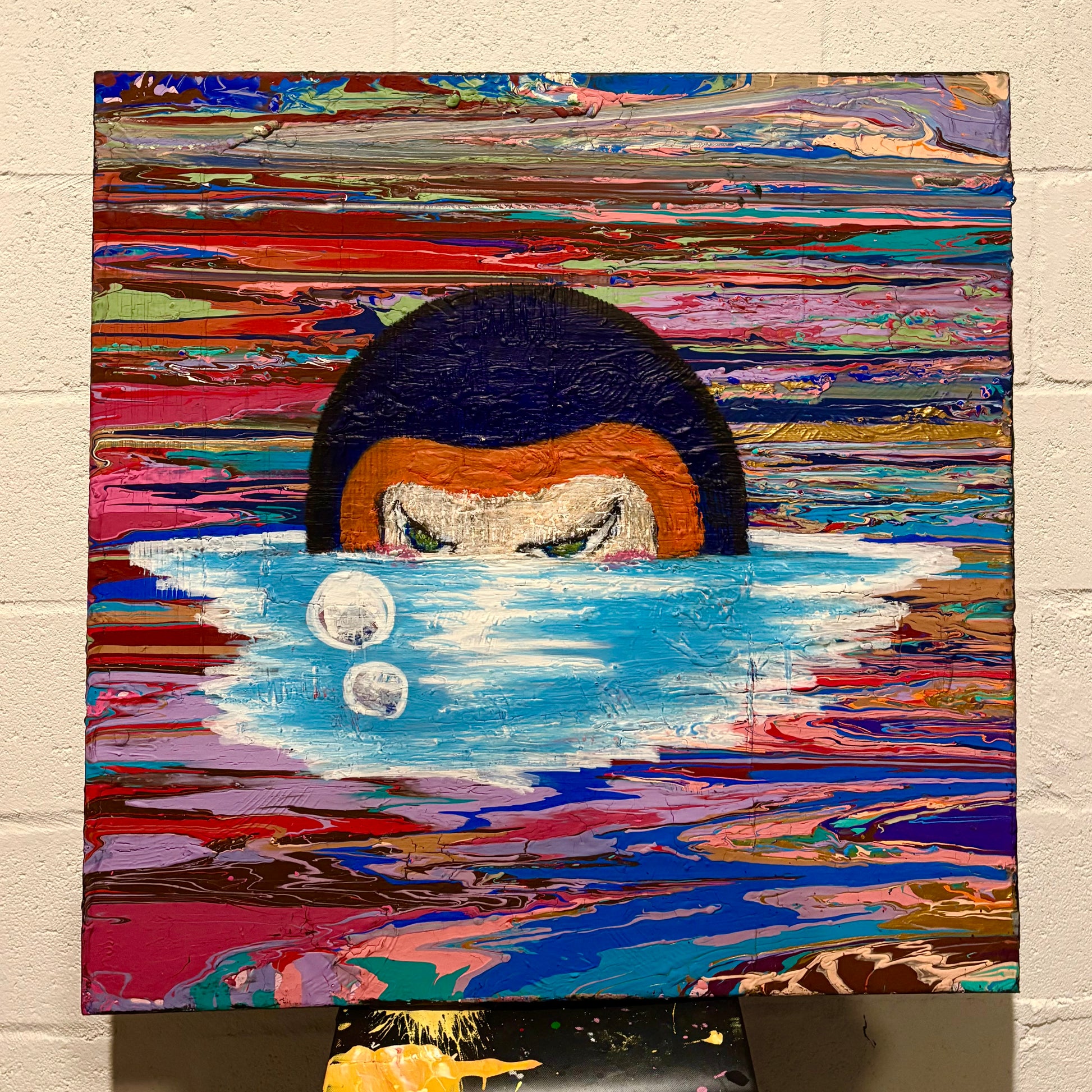Acrylic and oil pastel on stretched canvas.