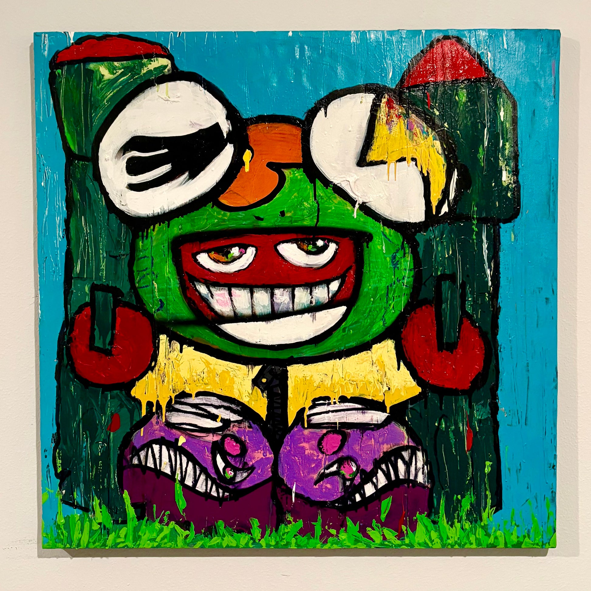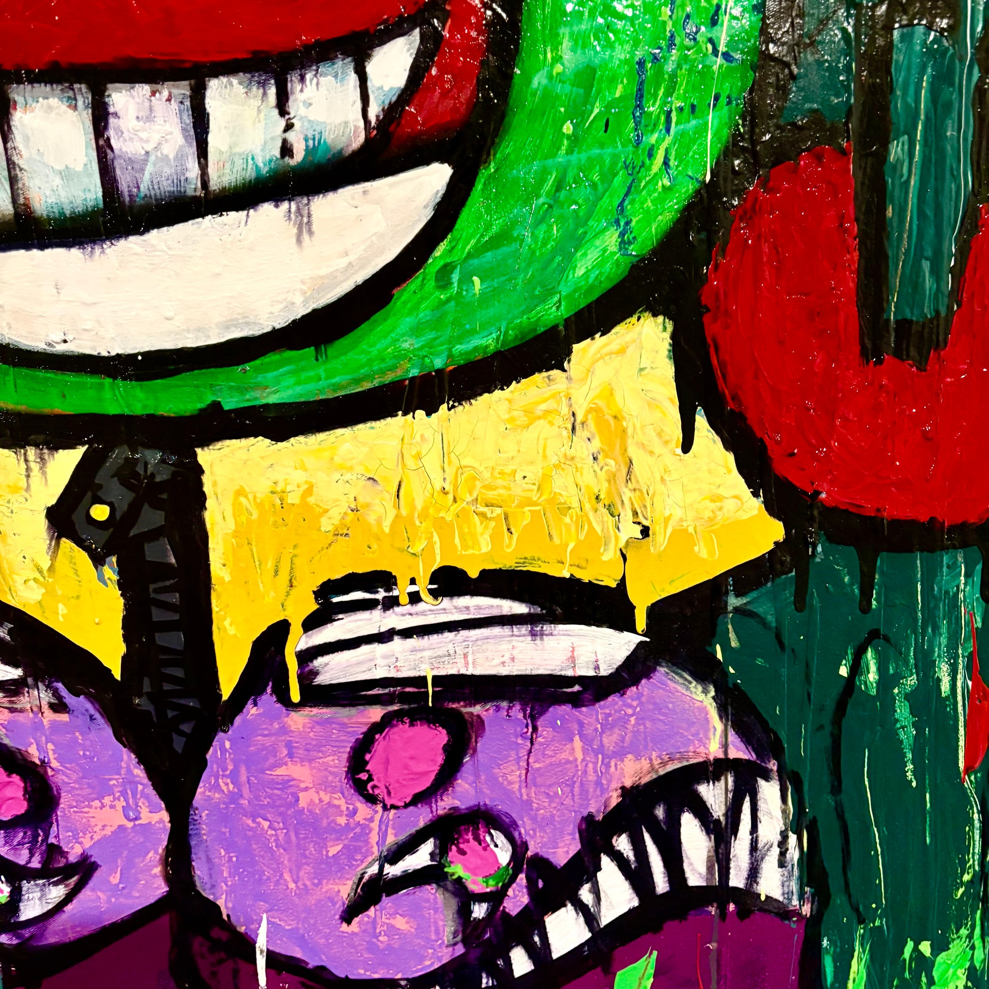 Acrylic, pastel, latex, and aerosol on stretched fabric.